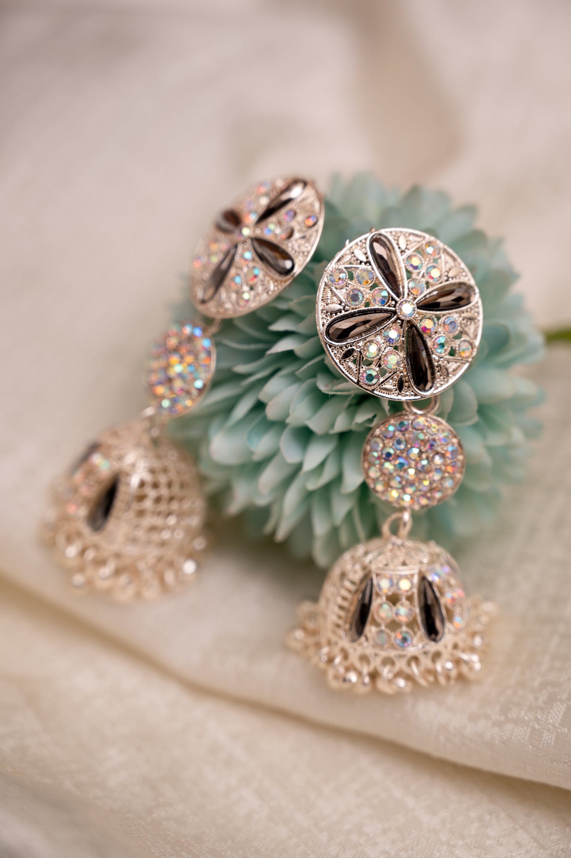 Enhance your elegance with these exquisite silver jhumka earrings from Zovo Jewels. Crafted with a stunning combination of black enamel and shimmering stones, these traditional earrings for women offer a perfect blend of classic charm and modern style. The intricate design, featuring a dazzling round stud and a beautifully detailed drop earring, makes them an ideal choice for festive occasions, weddings, or everyday elegance.