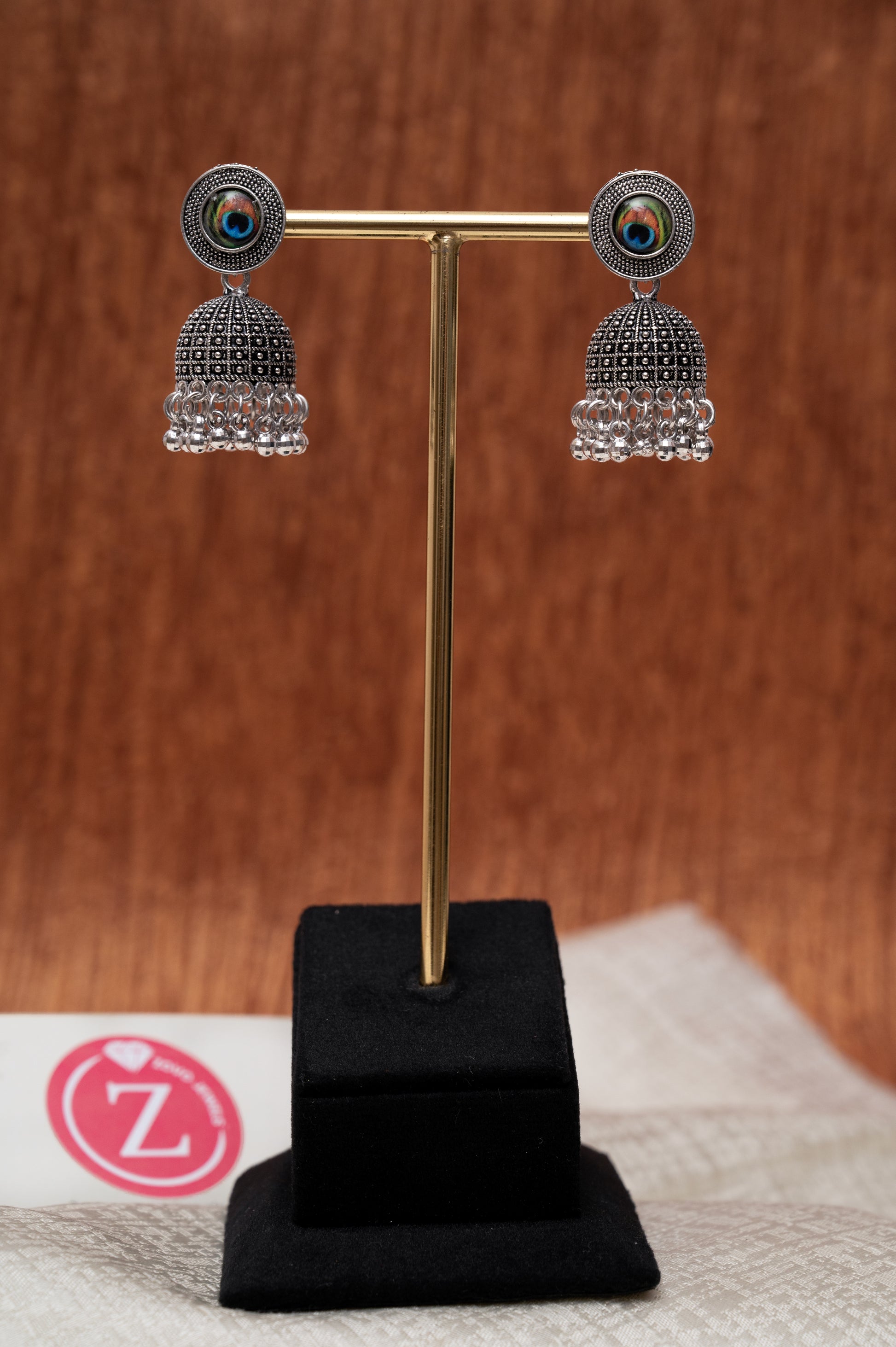 Add timeless charm to your ethnic ensemble with the Peacock Eye Oxidized Jhumka Earrings from Zovo Jewels. These beautifully crafted earrings reflect the elegance of traditional Indian jewellery, designed with a unique peacock-eye multicolor stone at the stud and intricately detailed oxidized silver dome Jhumka.