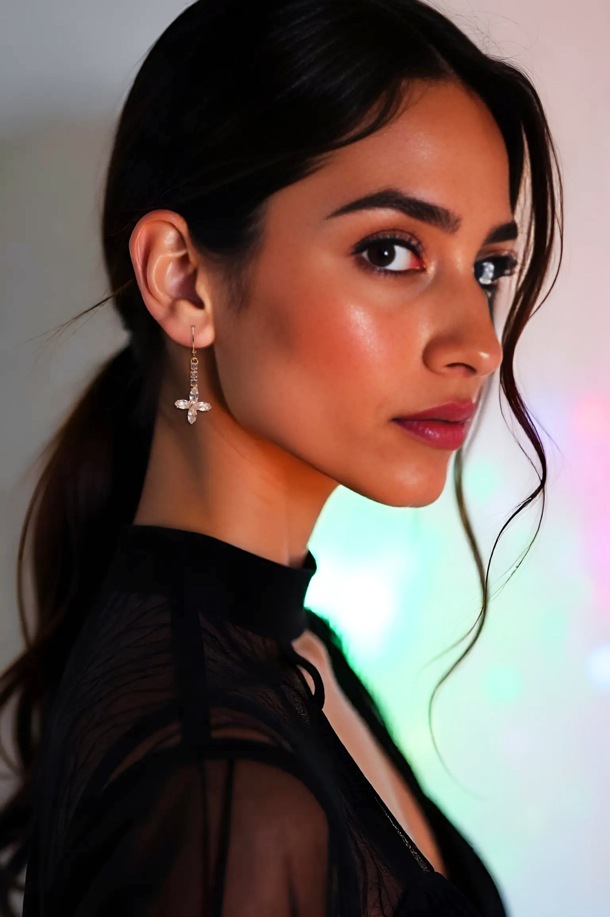 Suspended from a sleek, gold-plated metal base, each earring is adorned with a vertical line of dazzling round-cut zircon crystals, leading down to a radiant marquise-cut cross formation, creating a graceful silhouette that shimmers with every movement. Whether you're heading to a dinner party, a wedding, or a night out, these gold-plated crystal earrings are sure to elevate your look with a subtle yet luxurious appeal.